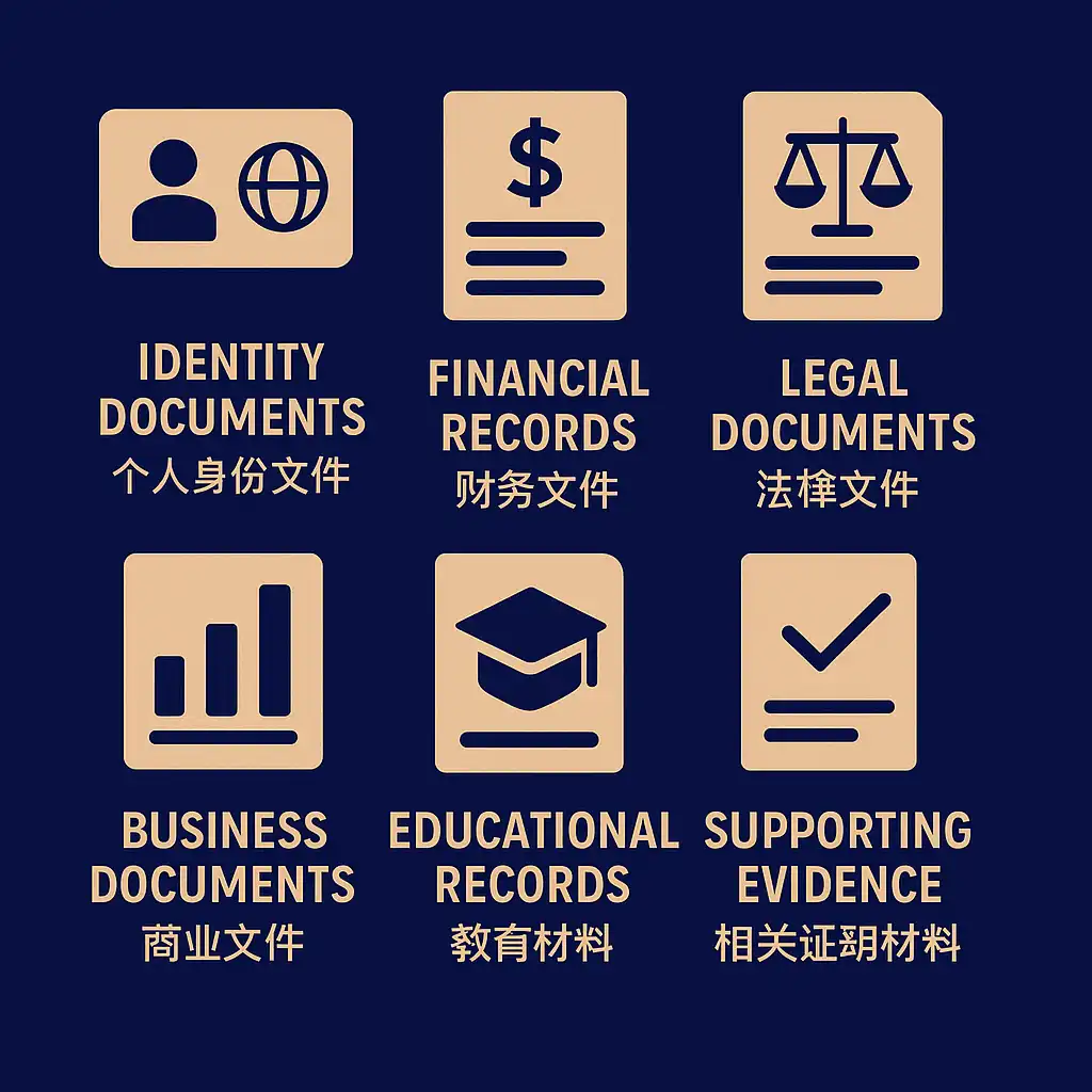 涵盖所有个人与商业移民材料,包括身份证明、财务文件、法律文件、商业计划书、教育/医疗材料等。