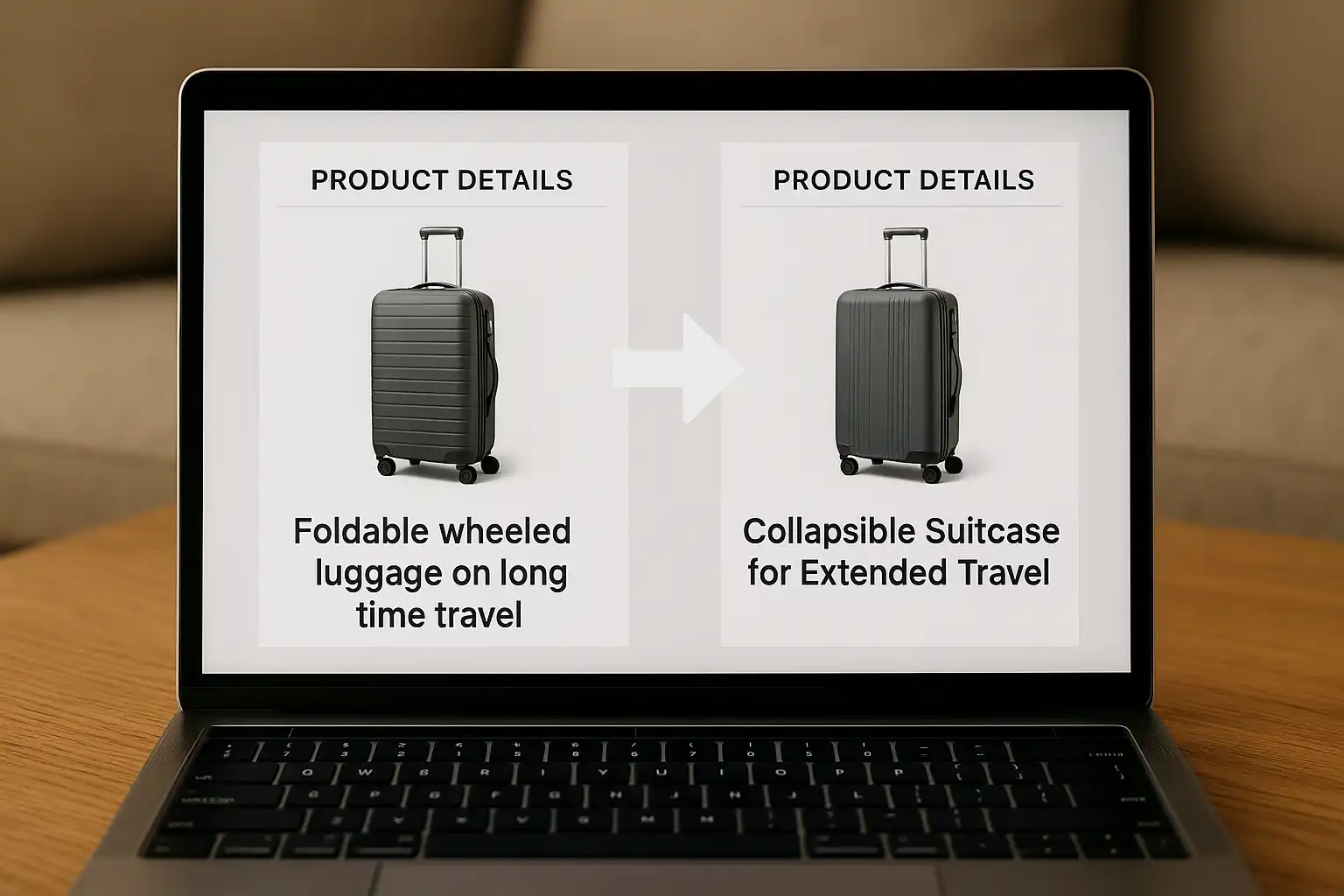 展示外贸产品页面翻译前后对比的写实图片:左侧为生硬直译的英文产品详情,右侧为地道流畅的本地化英文,体现外贸翻译质量提升后对买家信任度的影响。