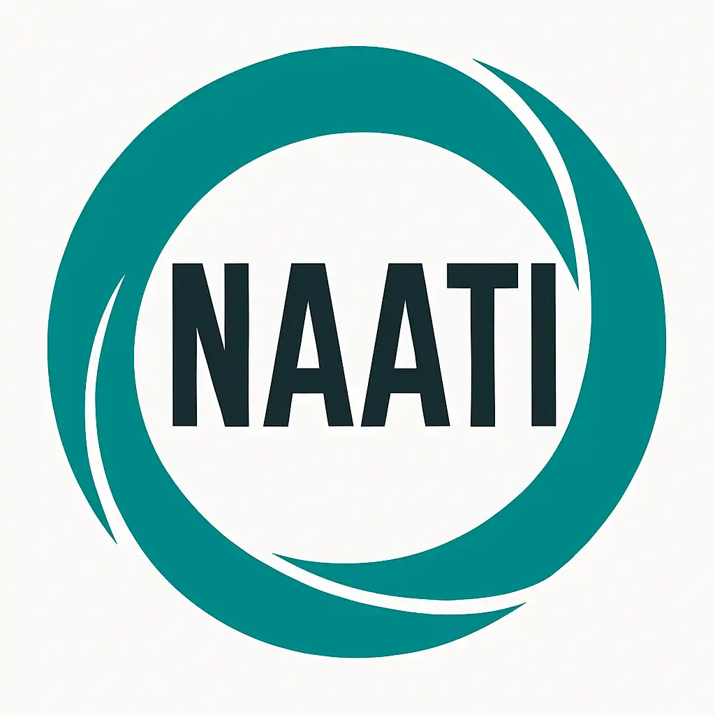 一个以青绿色旋转弧线环绕的圆形标志,中心是粗体黑色字母 NAATI ,整体呈现现代、干净、专业的视觉效果,类似 NAATI 官方风格的象征性图案