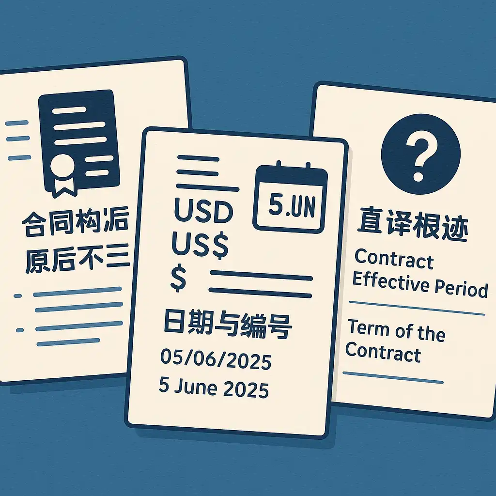 展示合同翻译常见问题的插图,包括合同条款前后不一致、发票金额与币种混乱、日期与编号格式不统一,以及“合同有效期”被直译为 Contract Effective Period 等典型直译痕迹。