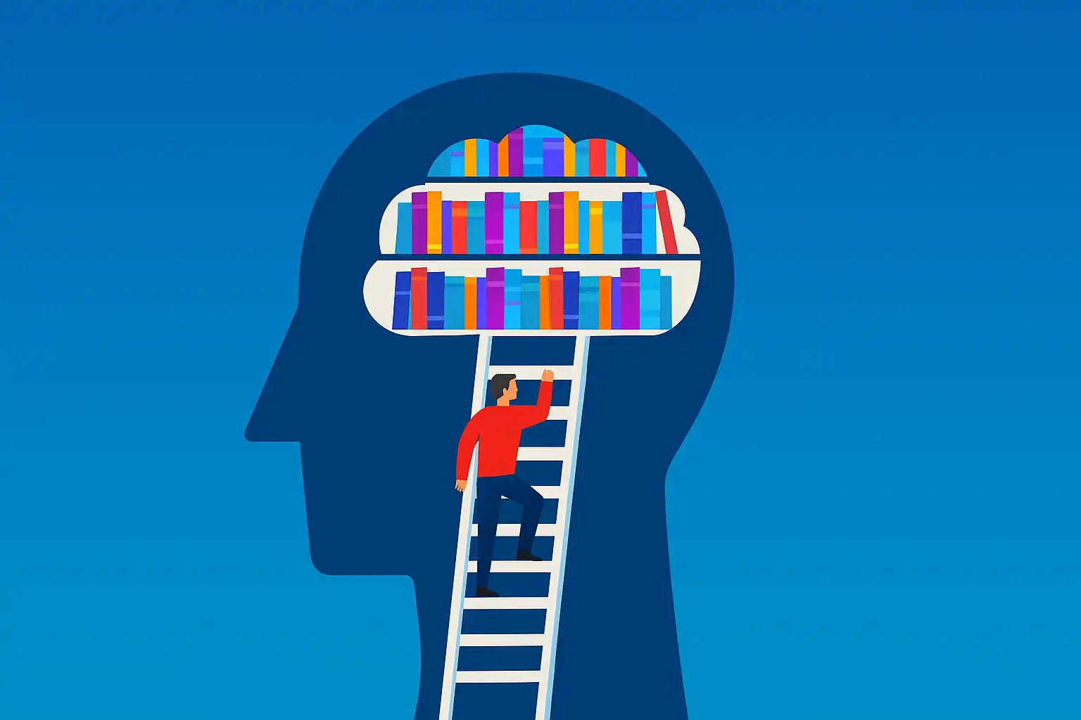 象征翻译记忆库(TM)的插图:一个人沿着梯子进入头部内部的“知识库”,其中整齐排列的彩色书籍代表重复条款、术语库与可复用内容,体现 TM 在合同翻译和发票翻译中的去重、术语统一与效率提升作用。